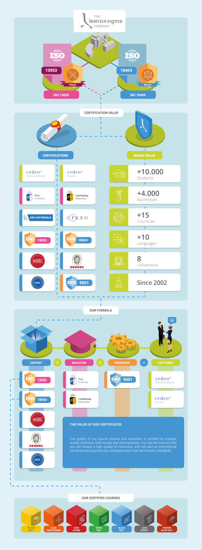 The Lean Six Sigma Company’s course content has been certified for the ISO 18404 and ISO 13053 standards. This means that the quality of the knowledge, skills and competences taught during our courses are entirely in line with the international standards of Lean Six Sigma competences and methods, as described by the ISO (International Organization for Standardization).